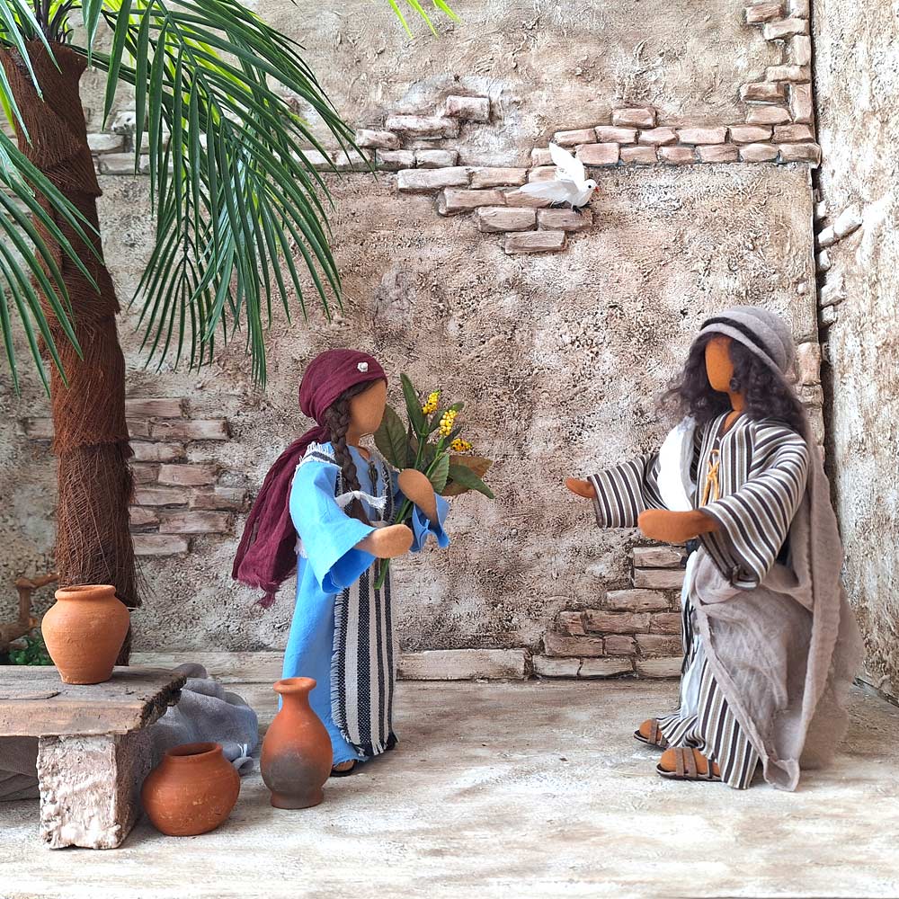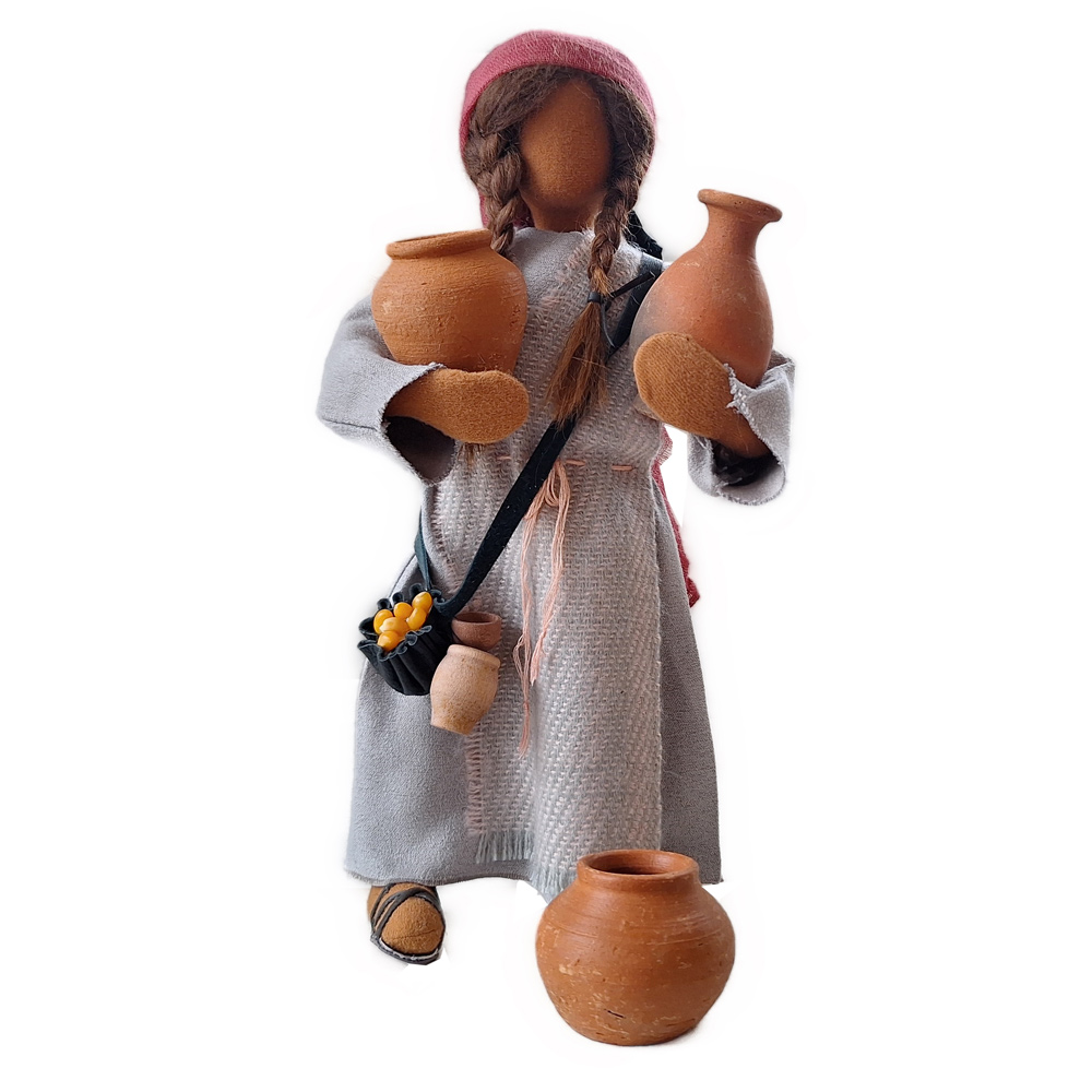 Hagar ist Saras schöne Sklavin. Abraham nimmt sie zur Zweitfrau, weil er mit Sara kein Kind bekommt. Welche Spannungen das gegeben hat, bleibt unserer Fantasie überlassen. Leicht war es sicher nicht. Aber wichtig, denn Hagar gebiert Ismael und ist somit die Urmutter des Zwölf-Stämmevolks der nordarabischen Ismaeliter.Du bekommst Hagar mit all ihren Utensilien und dem Tontopf im handgeknüpften Netz.
