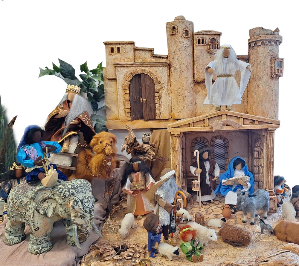 Die Krippe ist beliebig seitwärts erweiterbar. Mit Schachteln bauen Sie eine hügelige Landschaft, decken mit Gaze ab und schon können auch die Hirten am Lagerfeuer, die Heiligen Drei Könige, Kinder, Tiere und viele mehr am Weihnachtsgeschehen teilhaben.Beim Transport können kleine Holzlatten oder eine Schindel abgehen. Die befestigst du dann bitte einfach wieder mit Heißkleber oder einem Nagel. Dankeschön!