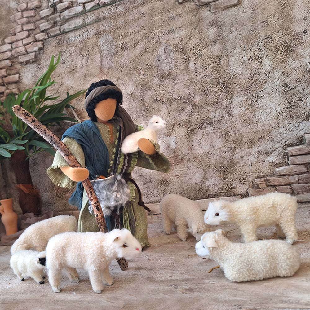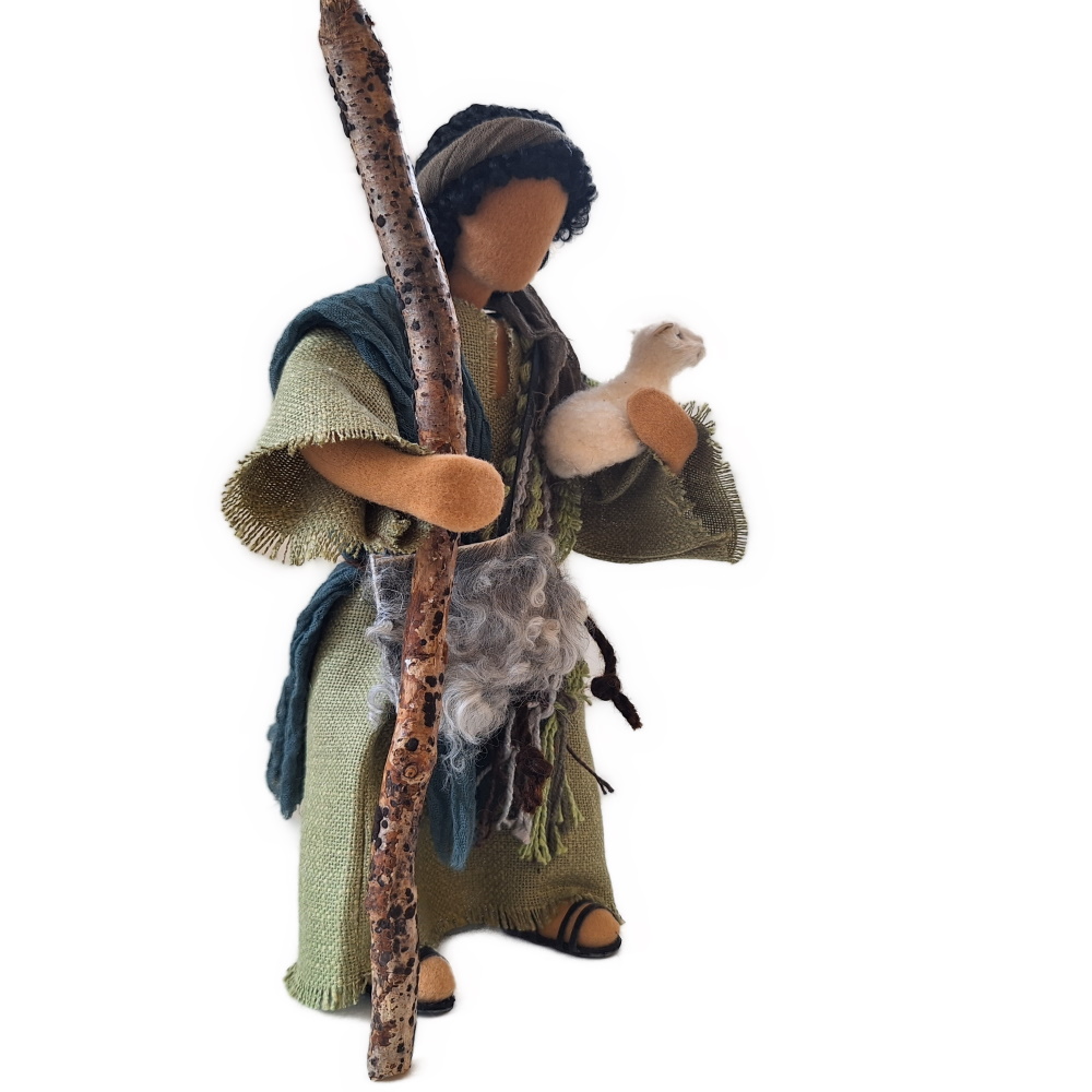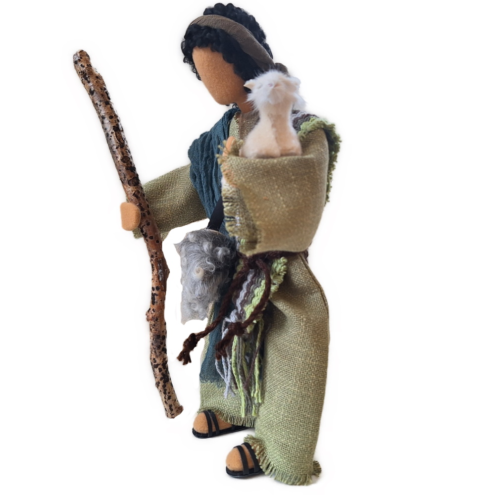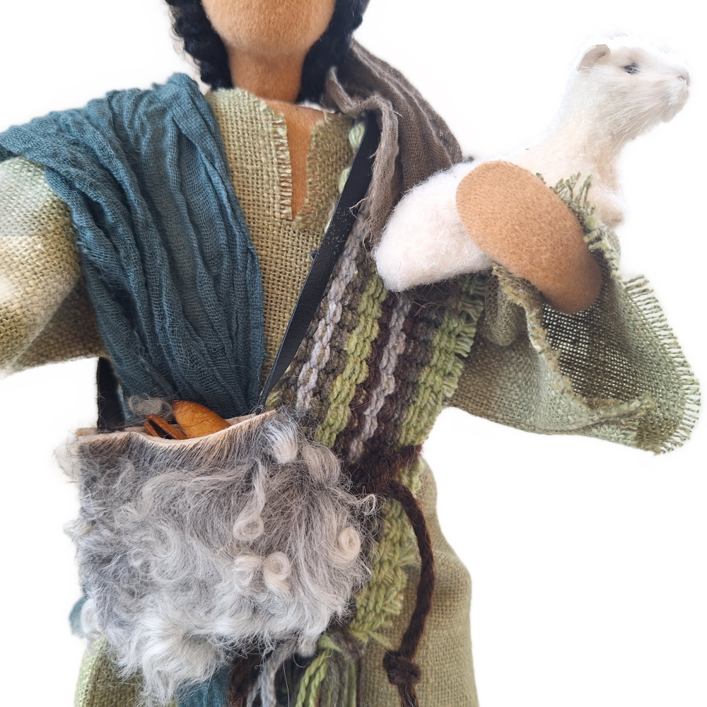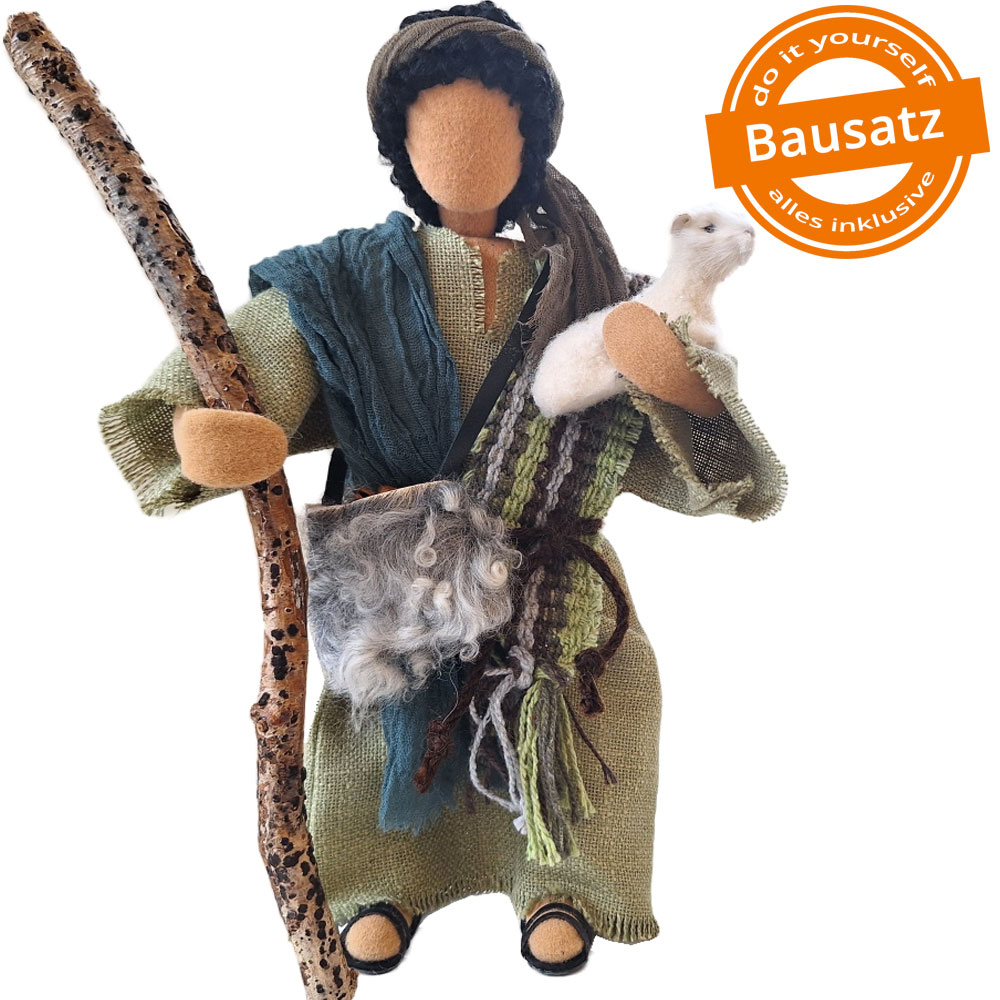 Das gesamte Arbeitsmaterial für den guten Hirten erhältst du gemeinsam mit seiner Kleidung und den Schuhen. Die zarten Grüntöne seiner Kleidung unterstreichen seinen sanftmütigen Charakter.