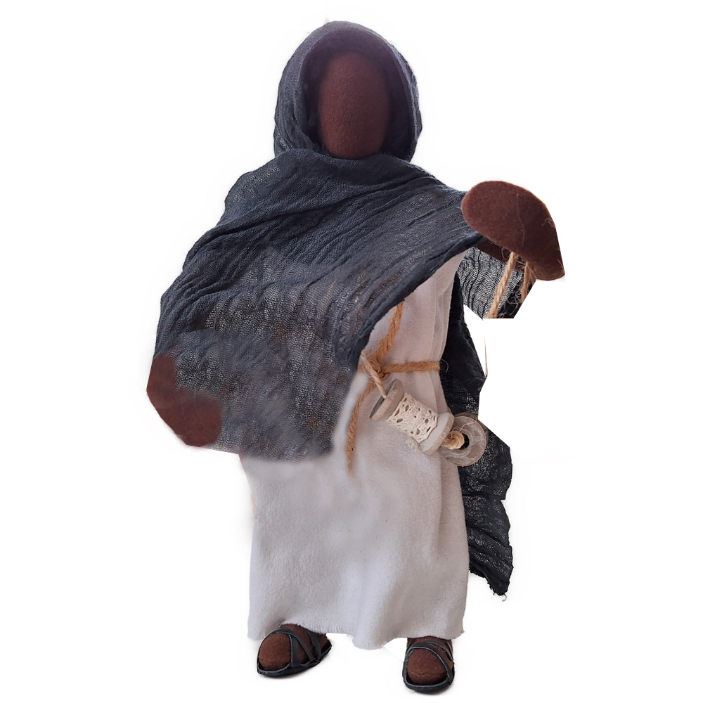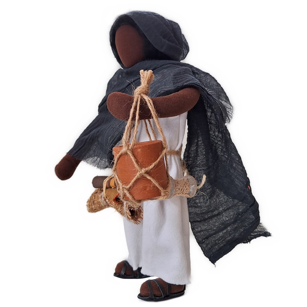 Hagar ist Saras schöne Sklavin. Abraham nimmt sie zur Zweitfrau, weil er mit Sara kein Kind bekommt. Welche Spannungen das gegeben hat, bleibt unserer Fantasie überlassen. Leicht war es sicher nicht. Aber wichtig, denn Hagar gebiert Ismael und ist somit die Urmutter des Zwölf-Stämmevolks der nordarabischen Ismaeliter.Du bekommst Hagar mit all ihren Utensilien und dem Tontopf im handgeknüpften Netz.