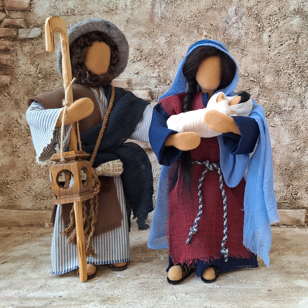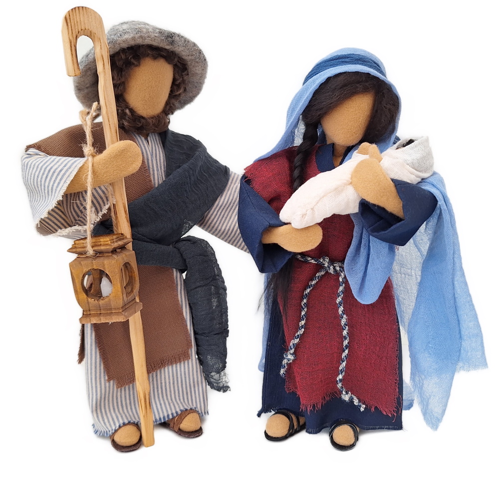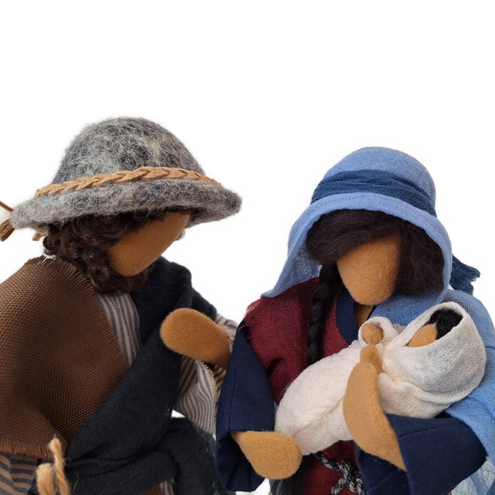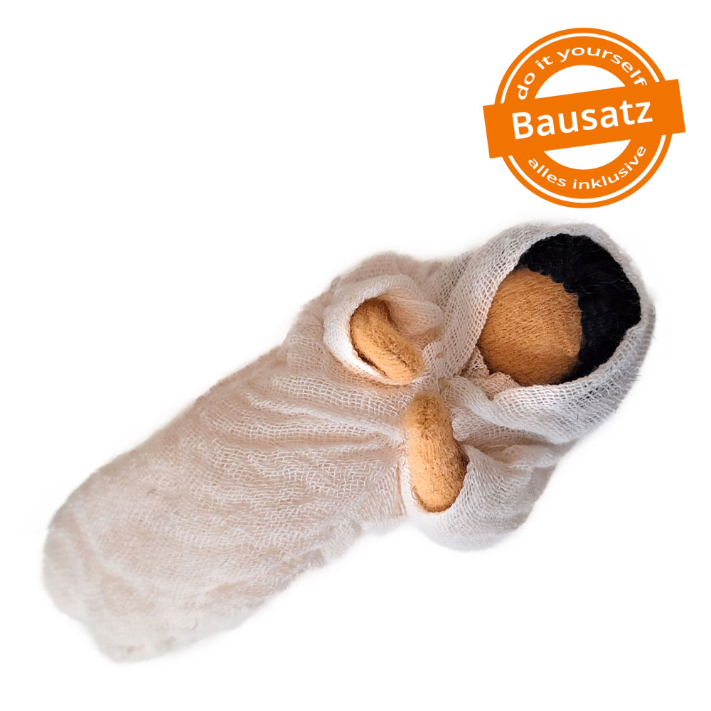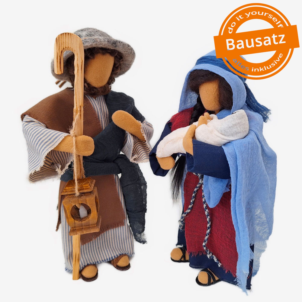 Du erhältst das gesamte Arbeitsmaterial für Maria und Josef sowie für das aufwändigere Jesuskind mit den sichtbaren Ärmchen. Mit dabei auch die Kleidung für Maria und Josef und die Ledersandalen und den handgefilzten Hut.
