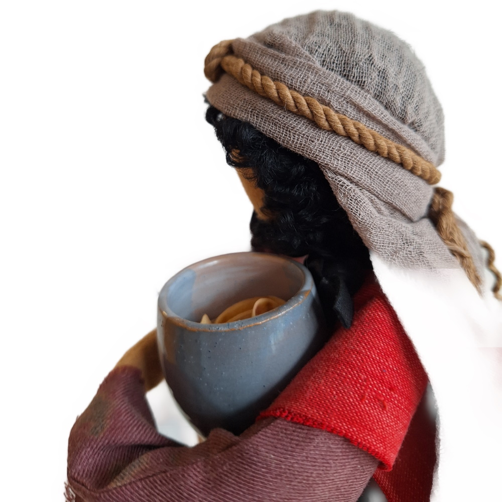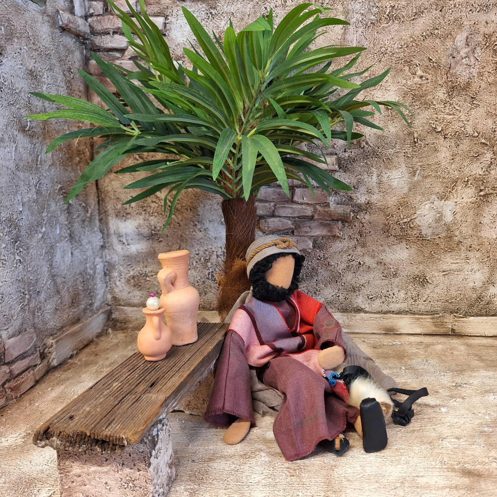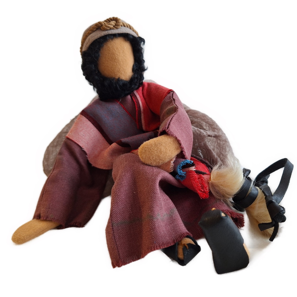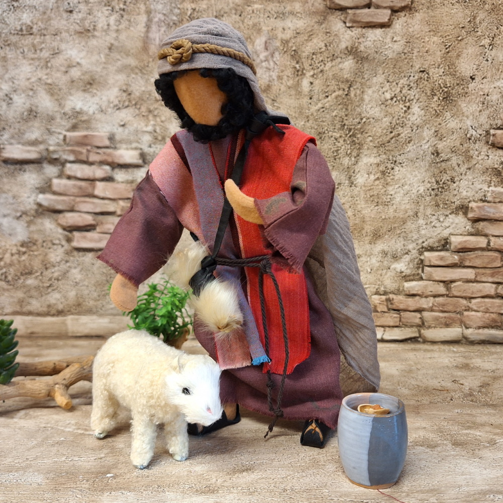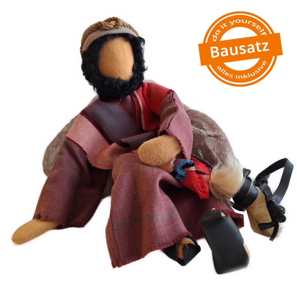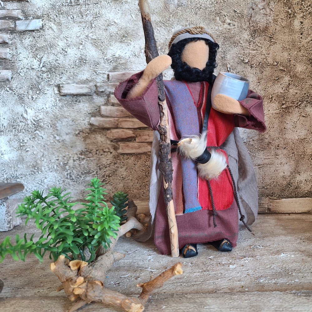 Du erhältst das Arbeitsmaterial, um in Eigenleistung den Hirten herzustellen. Durch die neutrale Kleidung, die ebenso mitgeliefert wird wie Sandalen und Decke, eignet sich diese Figur auch gut als neutraler Mann oder Apostel.