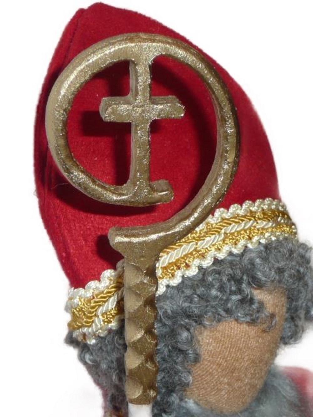 hängt, gebunden ist. Dazu rote Schuhe sowie eine wunderschöne stabile Mitra.