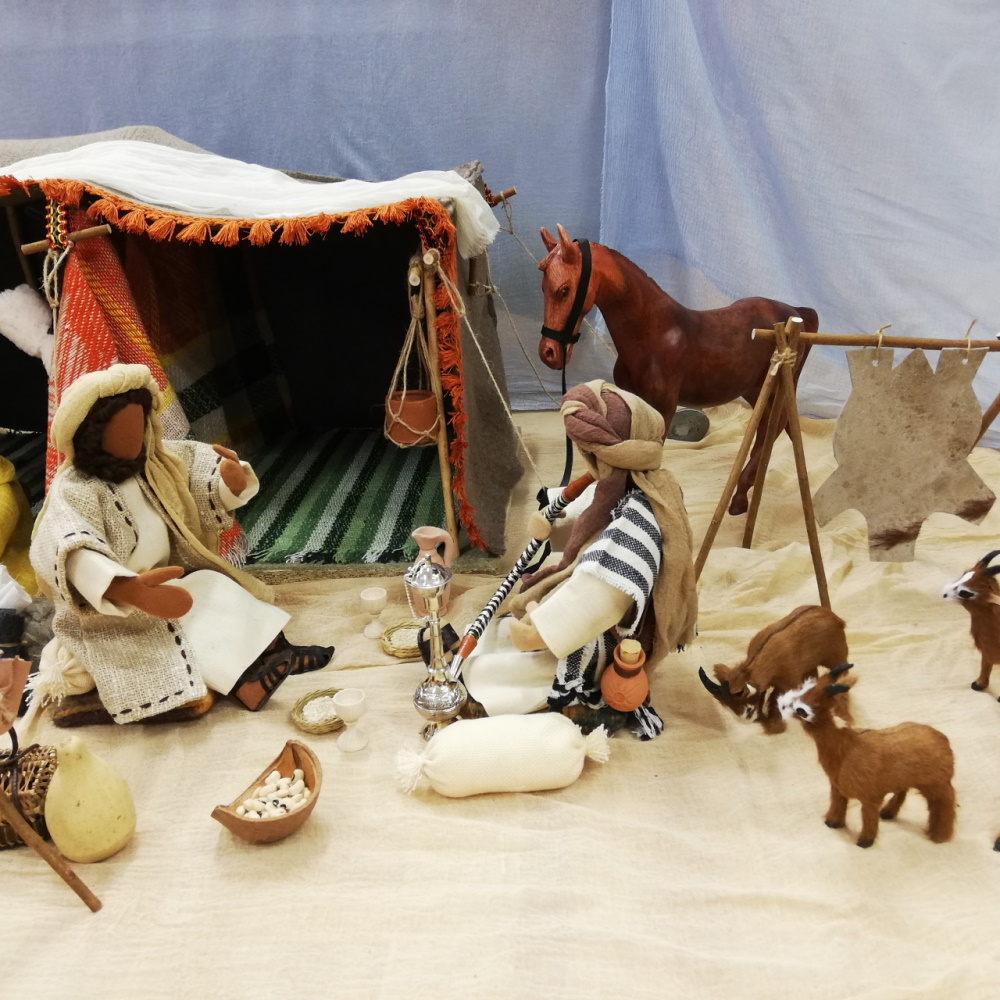 In aufwändiger Detailverliebtheit stellen wir Abrahams Nomadenzelt in unserem Atelier her. Es ist der Miniaturnachbau eines originalen Wüstenzeltes, genau abgestimmt auf 30 cm Erzählfiguren. Es ist einfach wunderschön und fasziniert Kinder wie Erwachsene gleichermaßen.