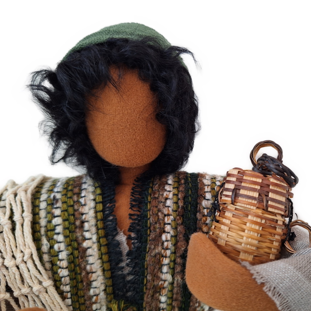 Petrus hat ein sehr schönes Gewand mit einem ganz speziellen Gürtel. Er hat zwei Fische dabei, einen Korb und