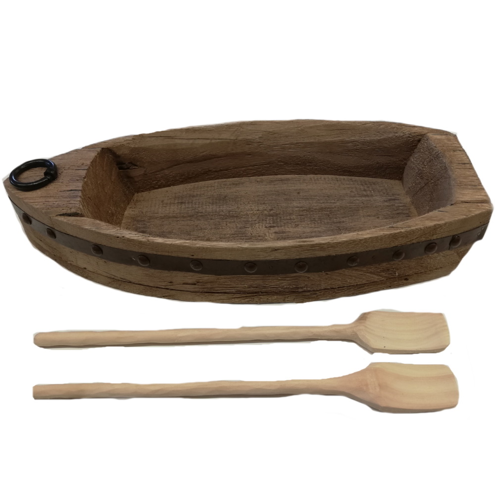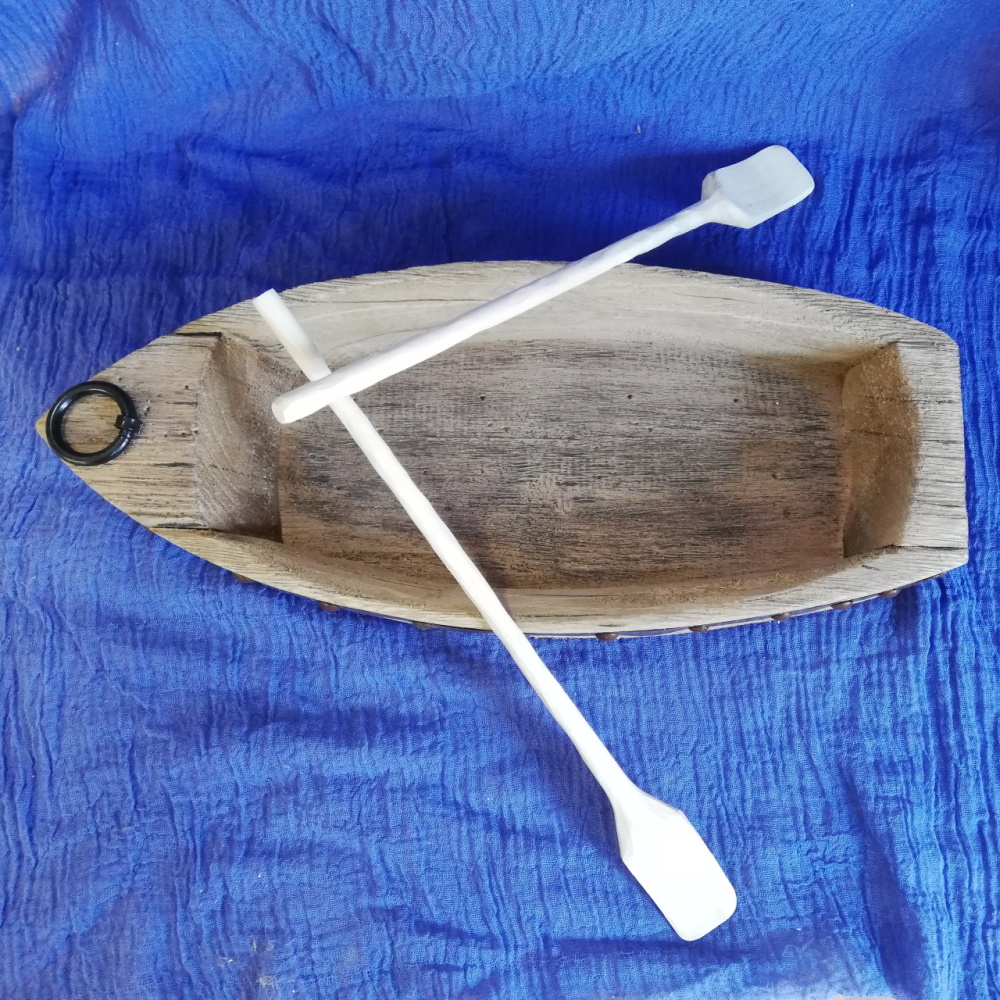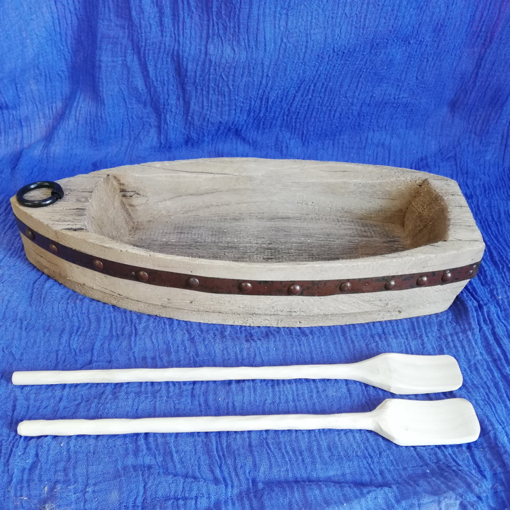 Authentischen Charakter verleiht diesem Schiff der grob behauene Rumpf, der mit Metallbordüre und Ankerring richtig gut zur Geltung kommt. Auch die beiden Ruder haben wir in unserem Atelier dazu gefertigt.