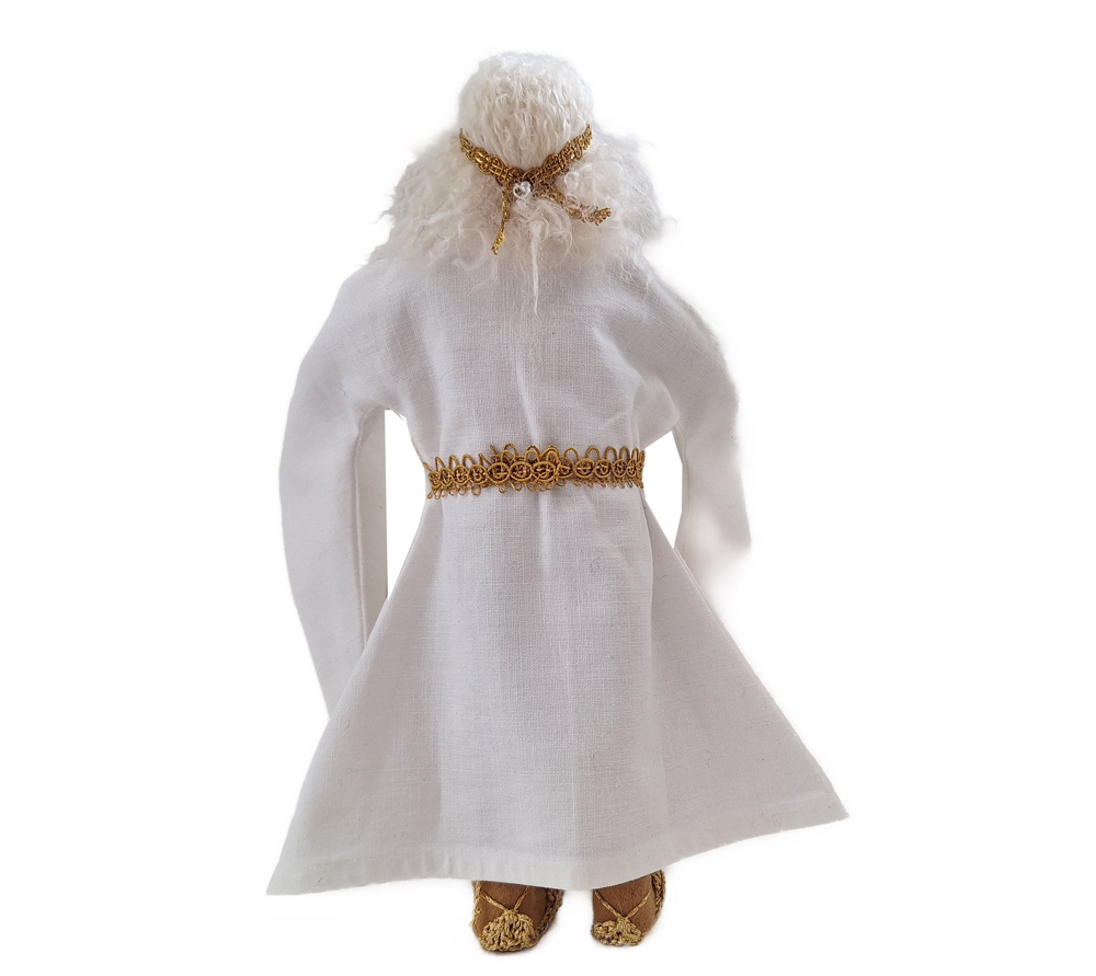 Der Erzengel Gabriel erstrahlt in Klarheit und Licht. Du erhältst das Arbeitsmaterial, um den Engel selber anfertigen zu können, sowie das aufwändig genähte Kleid mit den langen Trompetenärmeln, die handgehäkelten goldenen Schuhe und Gürtel und Haarreif.
