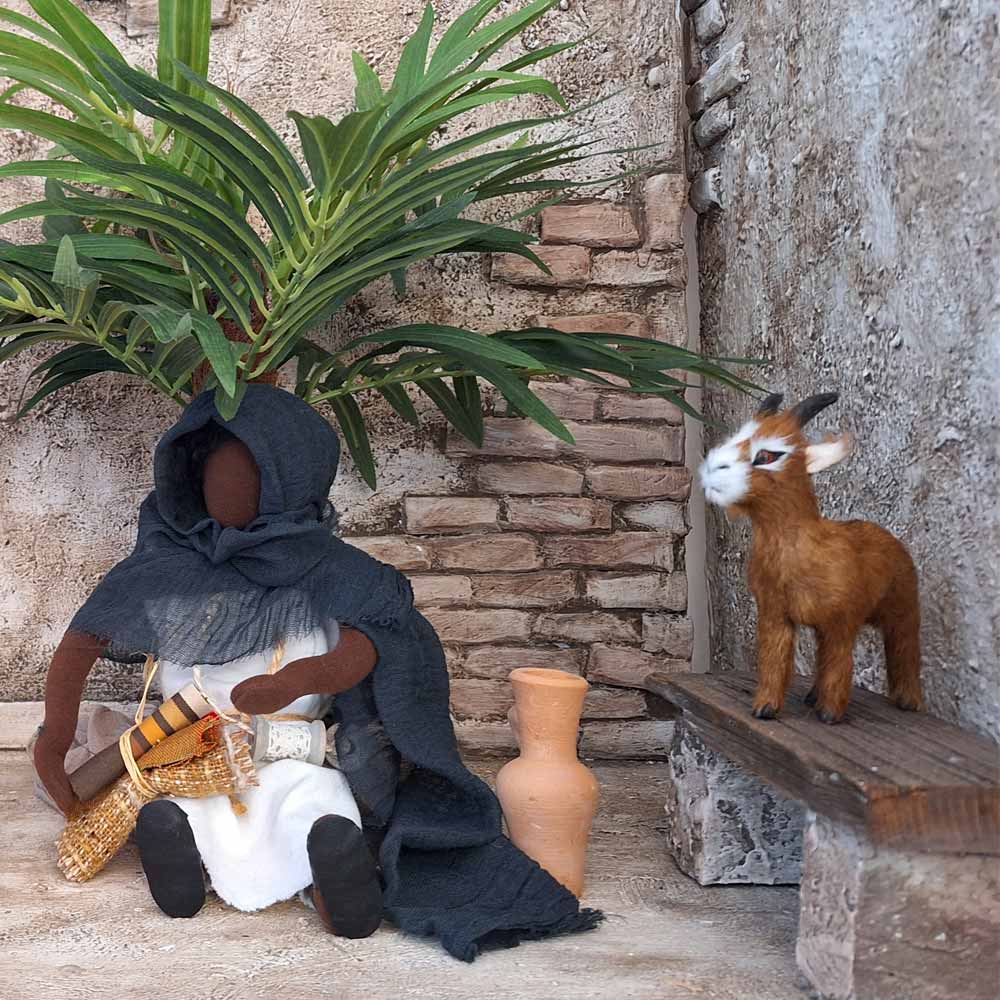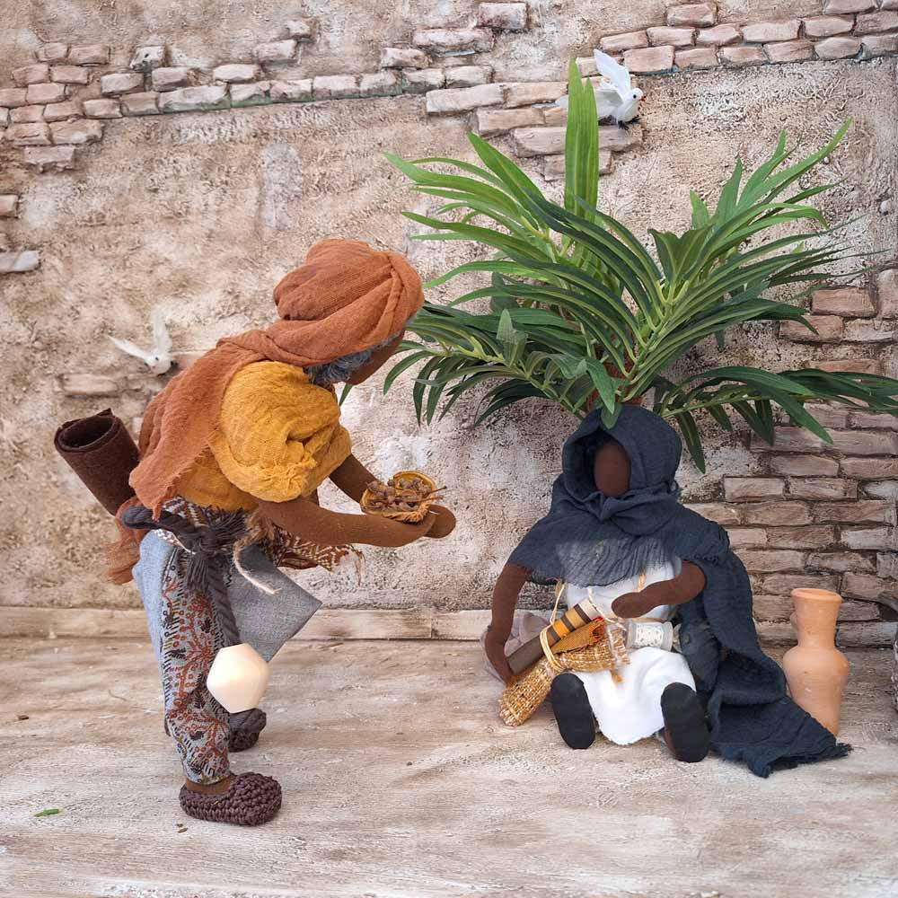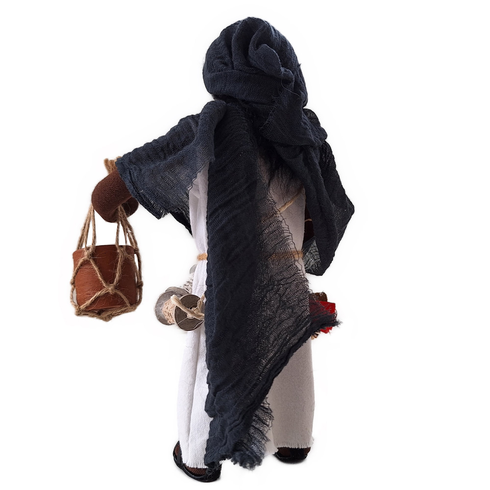 Hagar ist Saras schöne Sklavin. Abraham nimmt sie zur Zweitfrau, weil er mit Sara kein Kind bekommt. Welche Spannungen das gegeben hat, bleibt unserer Fantasie überlassen. Leicht war es sicher nicht. Aber wichtig, denn Hagar gebiert Ismael und ist somit die Urmutter des Zwölf-Stämmevolks der nordarabischen Ismaeliter.Du bekommst Hagar mit all ihren Utensilien und dem Tontopf im handgeknüpften Netz.