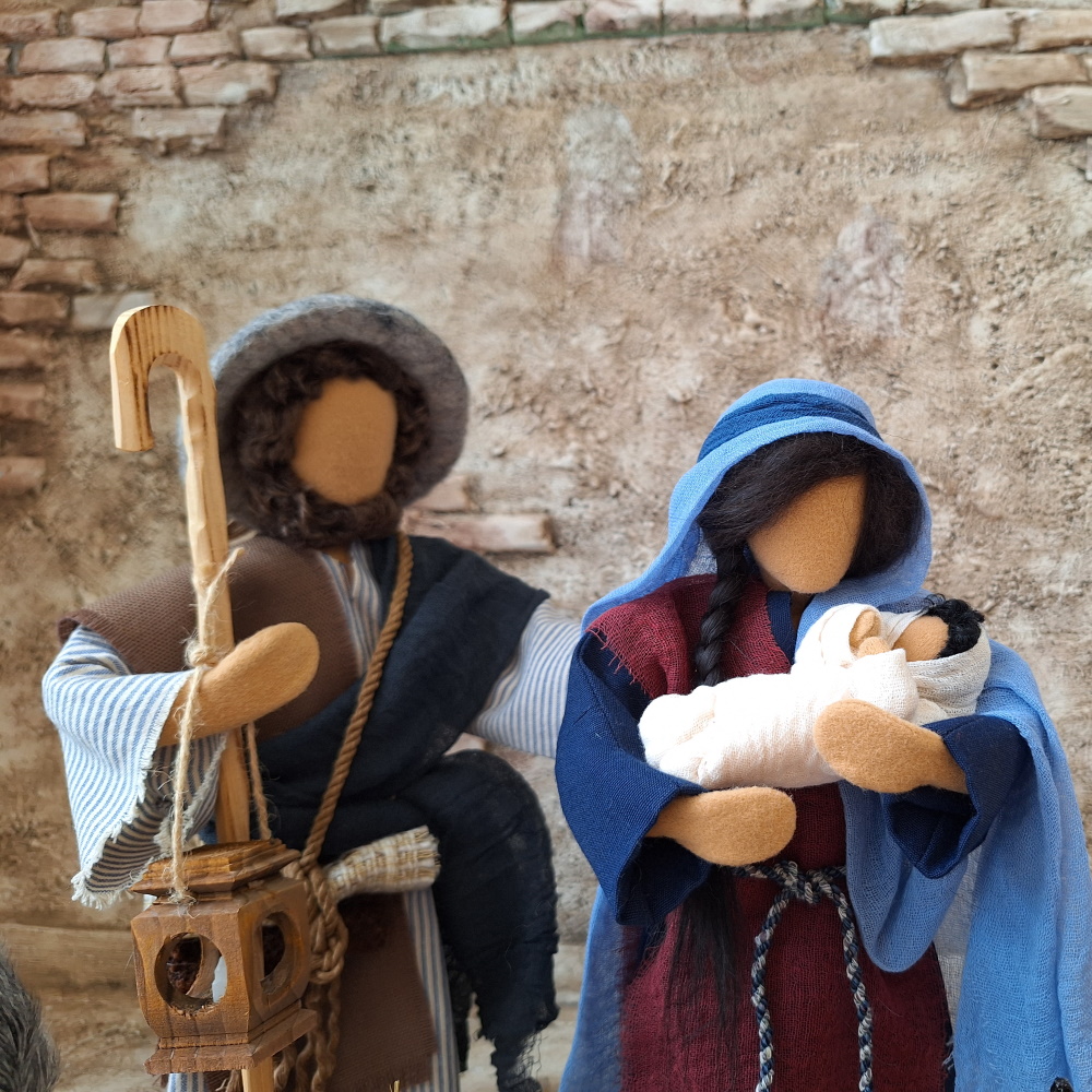 Du erhältst das gesamte Arbeitsmaterial für Maria und Josef sowie für das aufwändigere Jesuskind mit den sichtbaren Ärmchen. Mit dabei auch die Kleidung für Maria und Josef und die Ledersandalen und den handgefilzten Hut.