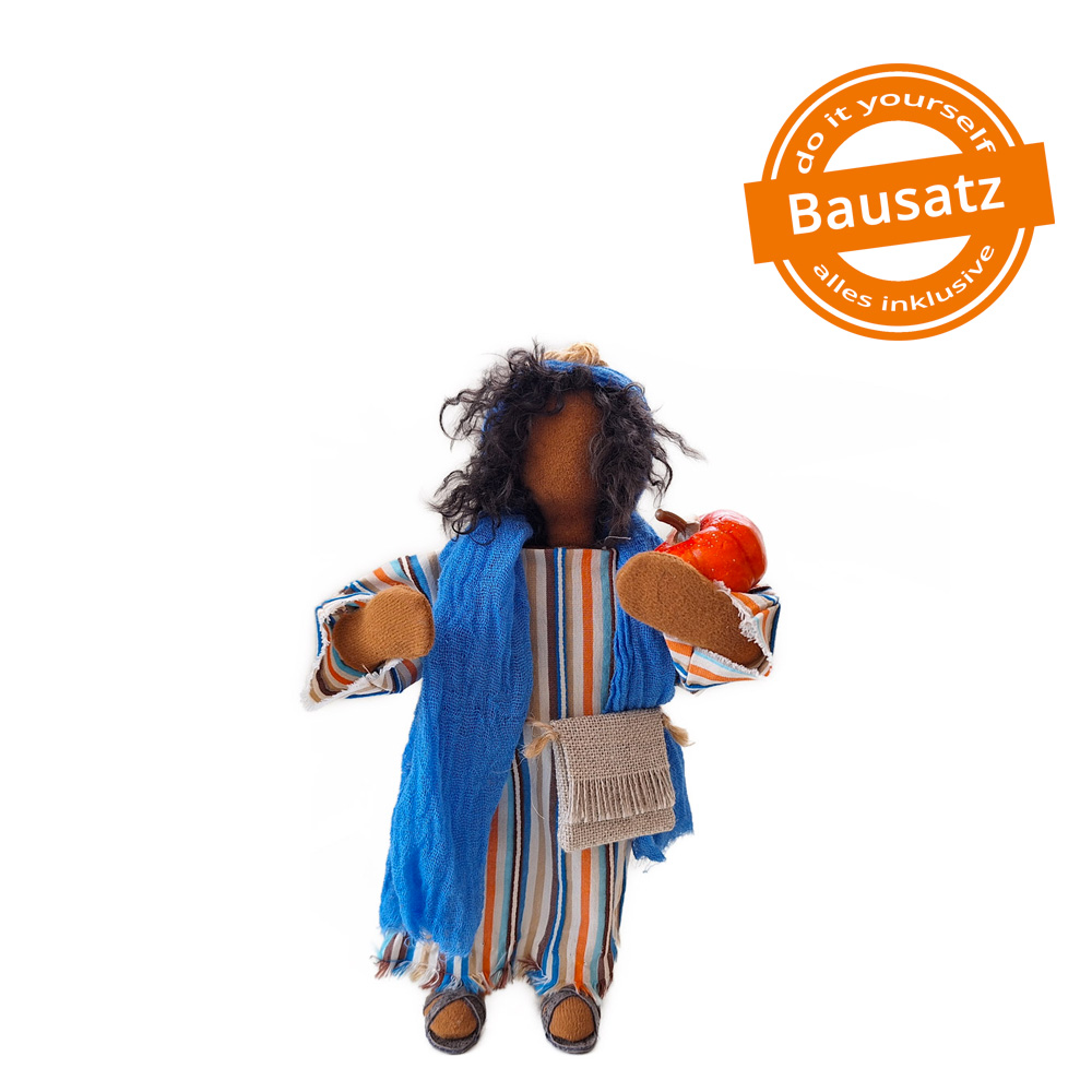 Du erhältst das Arbeitsmaterial, um den Bub mit der besonders fröhlichen Ausstrahlung herzustellen. Im Bausatz sind seine Kleidung, die Tasche, der Kürbis und die Sandalen enthalten. Der Junge hat einen Kürbis gefunden und bringt ihn freudestrahlend zu seiner Mutter nach Hause. Das wird ein Festessen!