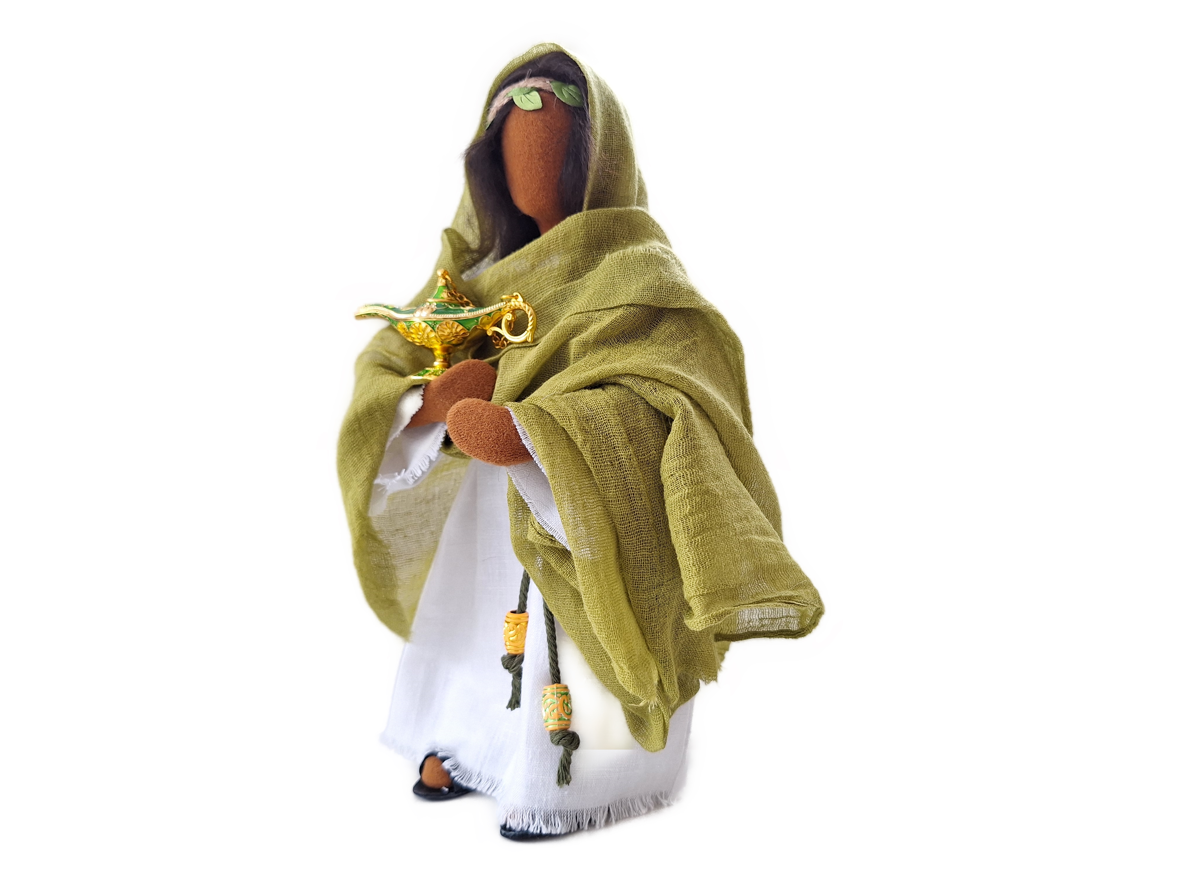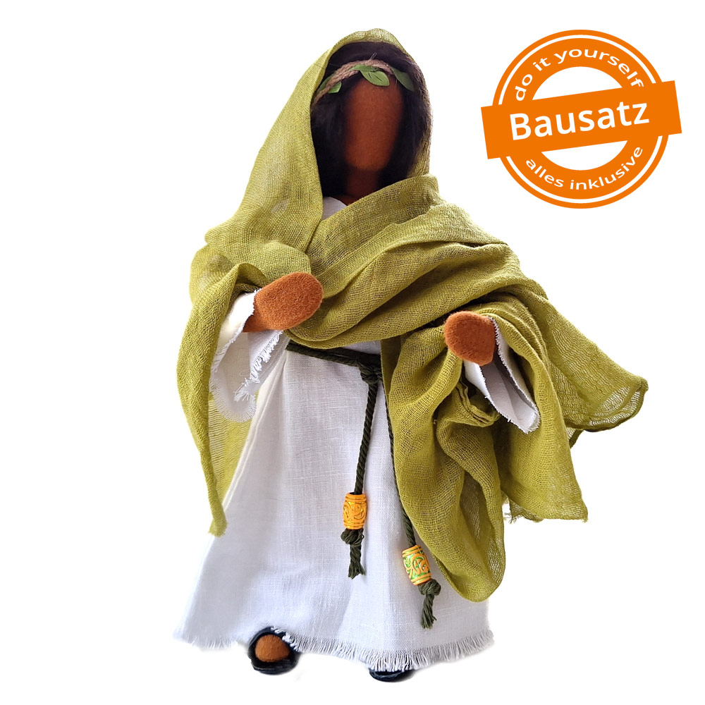 Du erhältst das Arbeitsmaterial sowie Kleidung und Schuhe, um die Jungfrau herstellen zu können. Wenn die Jungfrau klug ist und genügend Öl bei sich trägt, dann ist sie immer bereit, wenn der Herr kommt. Ob die Öllampe genügend Öl enthält ist ein Geheimnis, das jeder Betrachter für sich entschlüsseln kann.
