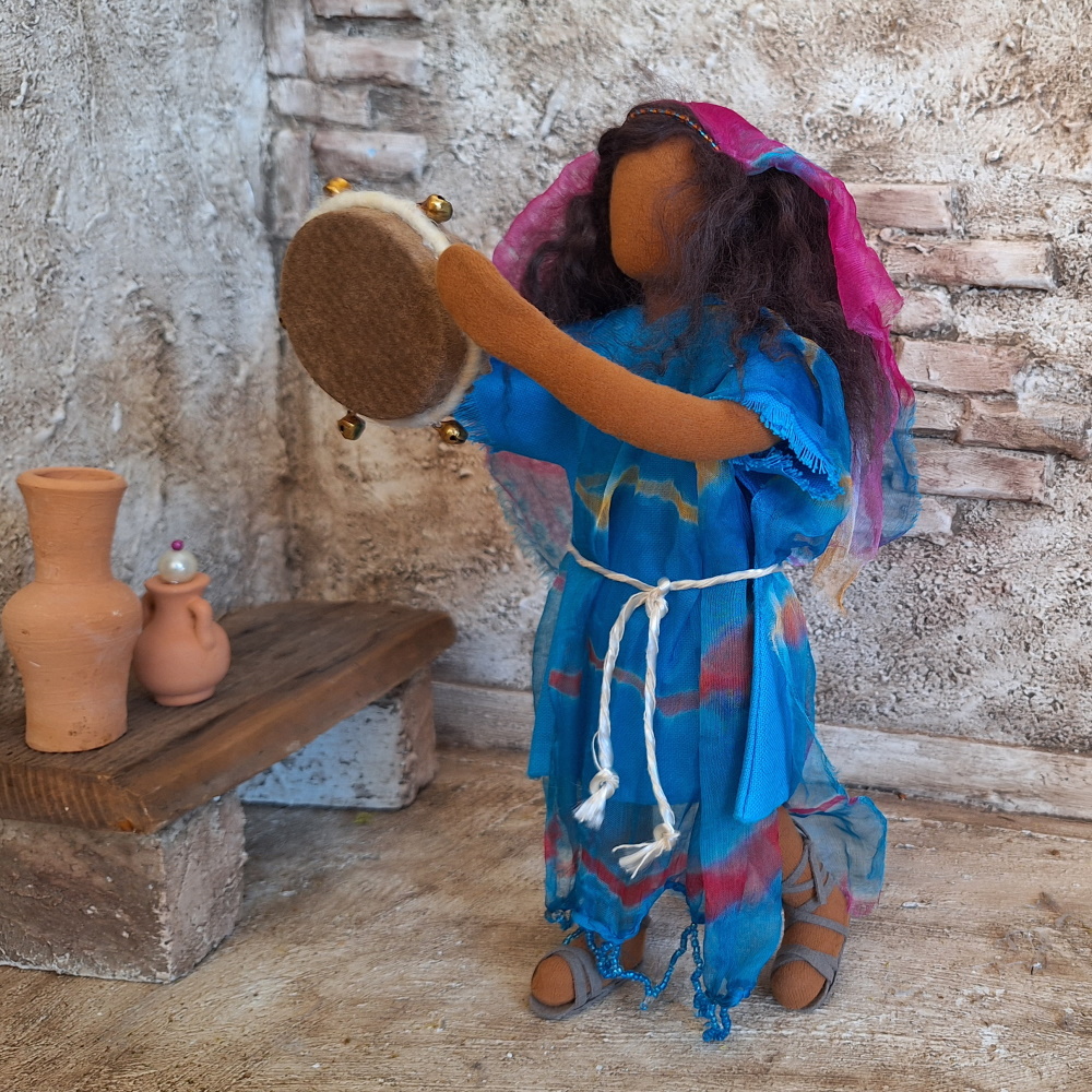 Du erhältst das Arbeitsmaterial, um die Figur Miriam in ihrer schönen farbenfrohen Kleidung herzustellen. Die Sandalen gehören auch zum Bausatz. Das Tamburin kannst du gerne mitbestellen.