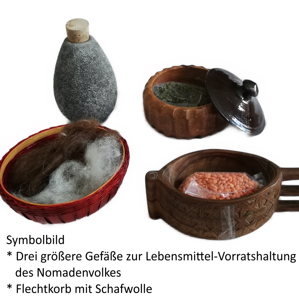Neben zahlreichen Körben, Töpfen und Schalen finden Sie auch ausgefallene Dinge wie ein Fell, das gerade gegerbt wird, ein Moskitonetz für die Nacht, eine Heizstelle mit Kameldung, eine handgenähte Babywiege und vieles mehr. Entnimm das Zubehör bitte aus dem Detailbild.