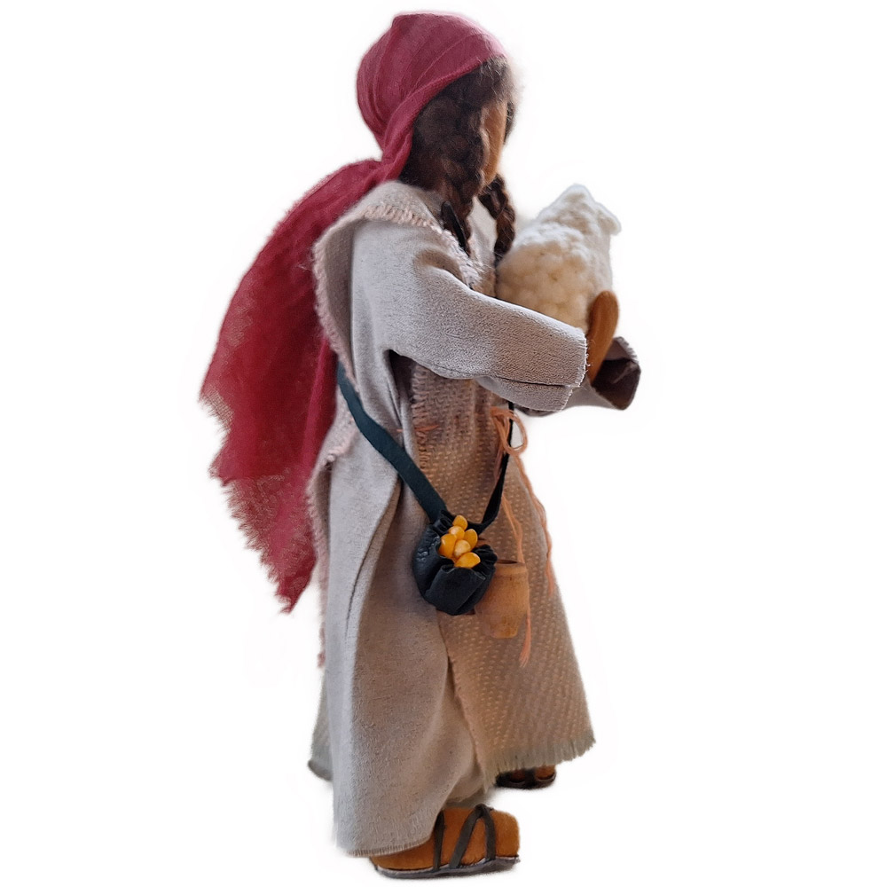 Die Geschichte Rut erzählt vom Fremd sein und Heimisch werden. Sie reist mit ihrer Schwiegermutter Noomi - beide verwitwet - nach Bethlehem, wo sie Boas kennen lernt. Beide Frauen bemühen sich, dass er Rut heiratet, denn nur so sind sie sicher und auf Dauer überlebensfähig.Unsere Rut trägt ein bequemes Reisekleid mit großem Schleiertuch, um sich für die Reise gut bedecken zu können. Sie hat drei Körbe mit dabei, in denen sie ihre Habseligkeiten verstauen kann.